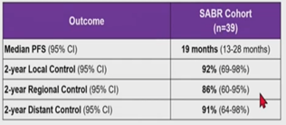 초기 비소세포암에서의 현재 표준 치료는 수술적 절제이다. 그러나 모든 환자에서 수술적 절제가 가능한 것은 아니어서 SABR는 수술적 절제가 불가능한 초기폐암에서 비교적 효과적이고 안전한 근치적 치료방법으로 활용되고 있다.2 수술과 정위절제방사선치료를 비교한 전향적 임상연구 결과에서도 정위절제방사선치료의 비열등성이 확인되기도 하였다.3, 4