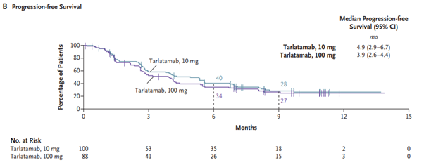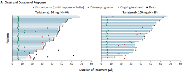 탈라타맙은 소세포폐암 환자의 85~94%에서 발현되는 DLL3 단백질과 면역세포를 유도하는 CD3 수용체를 표적으로 한다. 최근 발표된 논문에서 세계 17개국 56개 기관에서 소세포폐암의 1차 치료에 실패한 환자 220명을 모집하여 무작위로 나누어 임상시험을 진행했다. FDA 가이드라인에 따라 탈라타맙을 10mg과 100mg으로 나누어 환자들에게 투여한 후 치료 반응과 부작용 등의 예후를 살폈다. 그 결과, 임상 효과 면에서 예후 개선과 부작용 감소에는 10mg을 2주 간격으로 투여하는 것이 환자에게 최적인 것으로 밝혀졌다. 추적 관찰 기간 동안 객관적 치료 반응이 나타난 환자 비율은 10mg 그룹이 40%로, 100mg 그룹의 32%보다 높았다. 무진행 생존기간 중앙값도 10mg 그룹이 4.9개월로 100mg 그룹의 3.9개월로 나타났다. 치료 후 9개월 차에 추산한 전체 생존율도 각각 68%(10mg 그룹)와 66%(100mg 그룹)로 소폭 차이를 보였다.