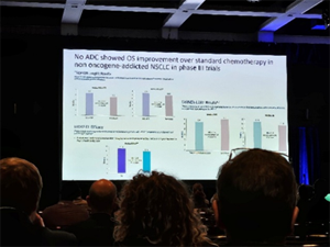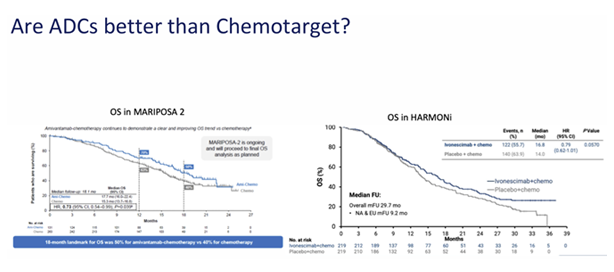 아직까지 여러 3상 임상연구에서 non oncogene-addicted NSCLC 환자에서 ADC가 chemotherapy에 비해, OS 개선을 보여주지 않은 것으로 보인다. TROPION-Lung 01 study에서는 Datopotamab deruxtecan과 Docetaxel의 효과를 비교, EVOKE-01 study에서는 Sacituzumab govitecan과 Docetaxel의 효과를 비교했으나 OS에서는 의미 있는 개선을 보여주지 못했다.